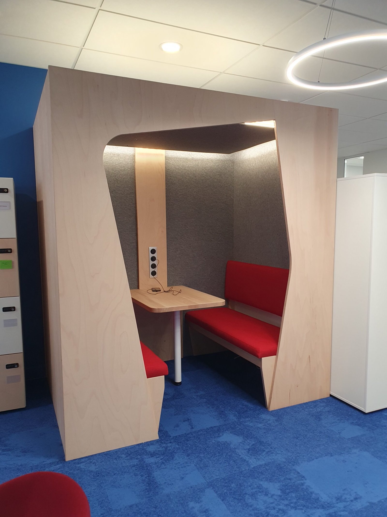 Nous avons imaginé cette alcôve comme un cocon collaboratif : un îlot de calme au cœur de vos open-spaces. Ses cloisons tri-couches (contreplaqué de hêtre, isolant biosourcé, feutre PET recyclé) absorbent les bruits parasites tandis que la table en bois massif favorise l’échange. Grâce à son hub électrique complet et à des assises généreusement rembourrées, chaque réunion devient un moment confortable et productif. Tissu lavable, classement au feu M1 ou M0, prévu pour les ERP.