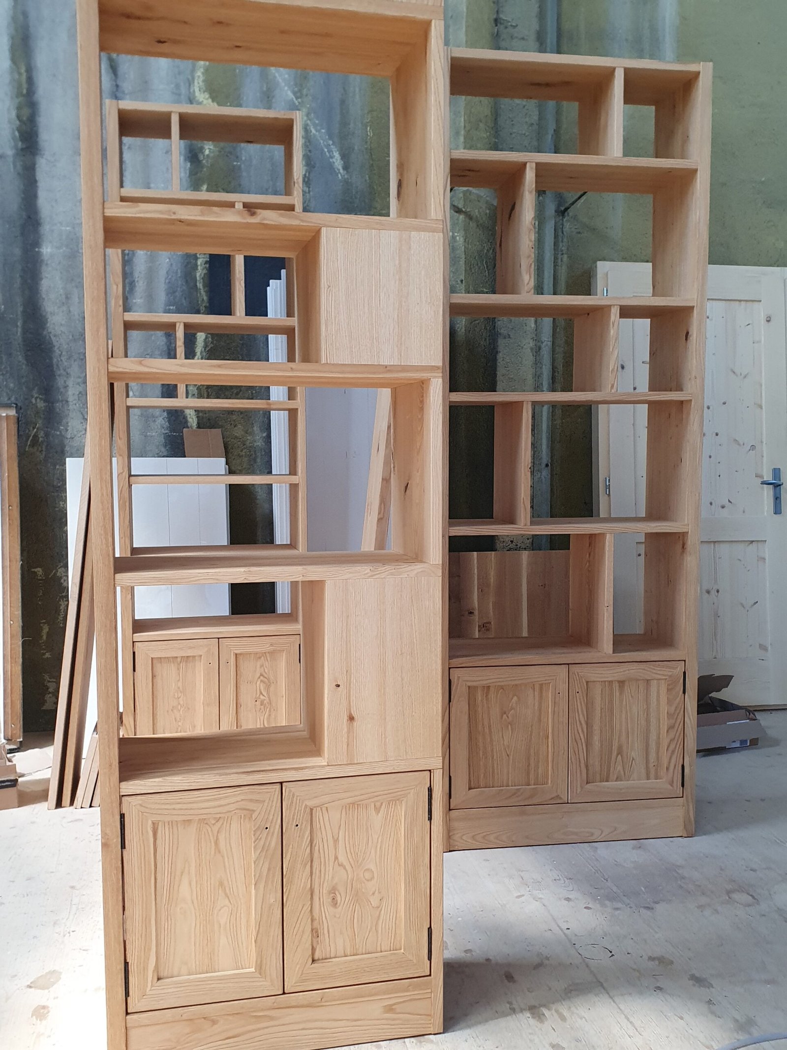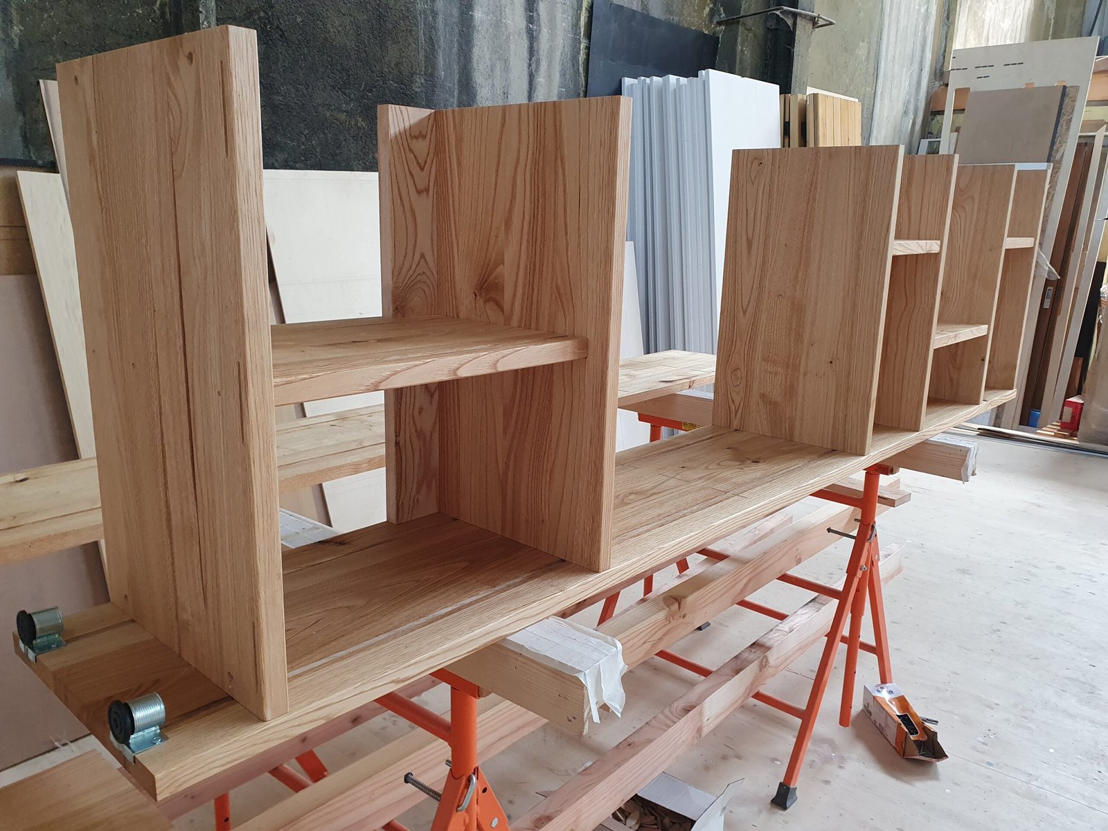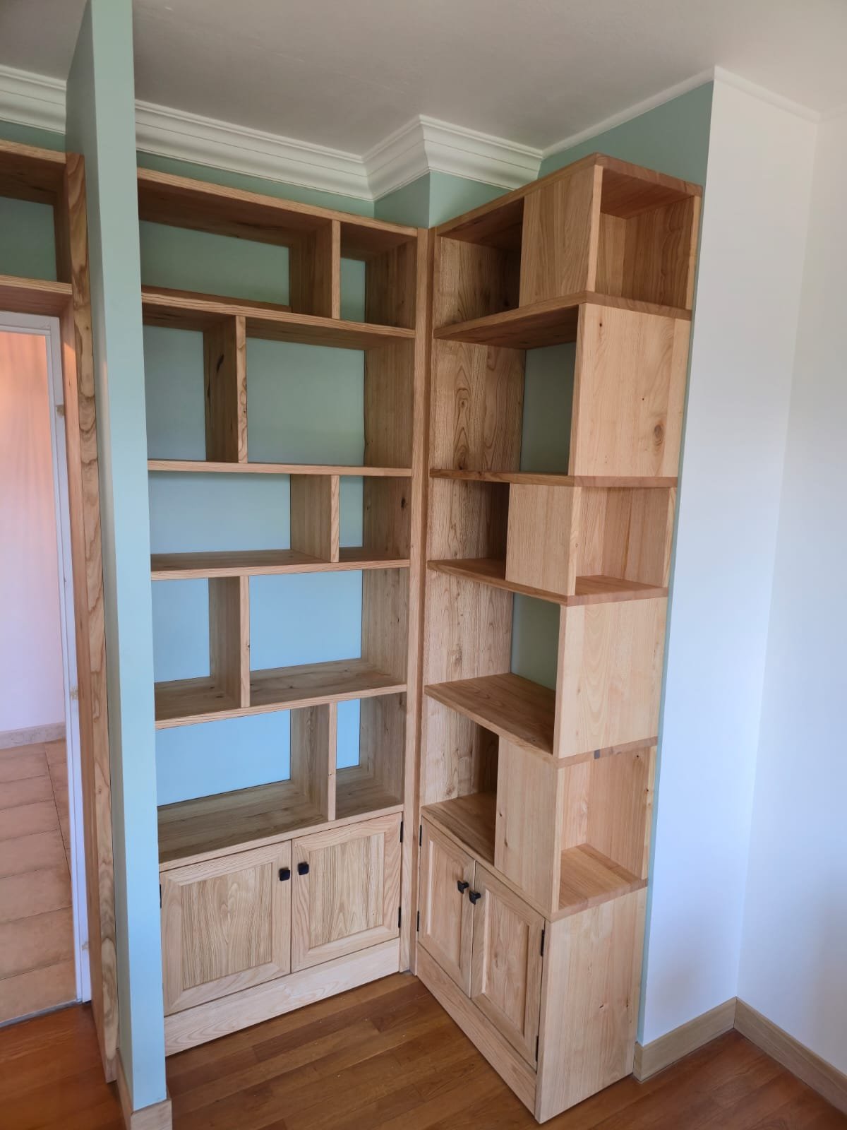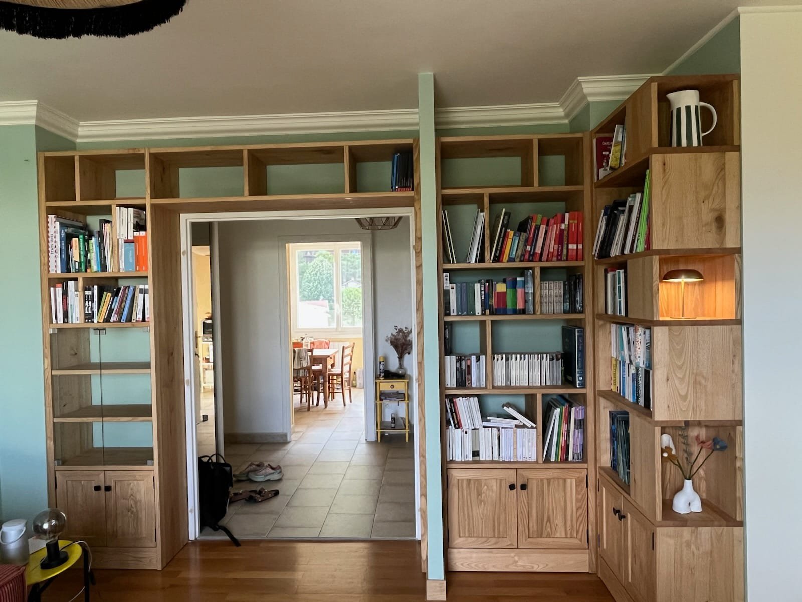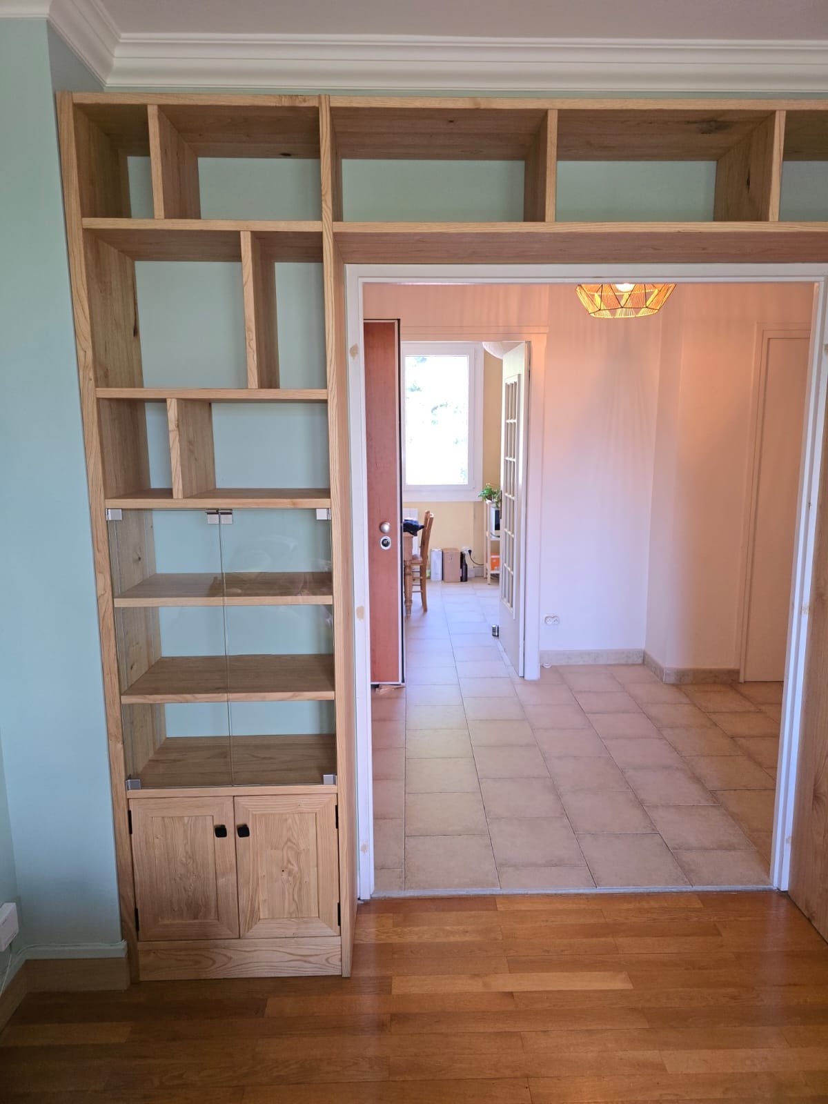 Habillage d'un mur avec une bibliothèque en châtaigner. Mise en place de porte de placards en bois et en verre.