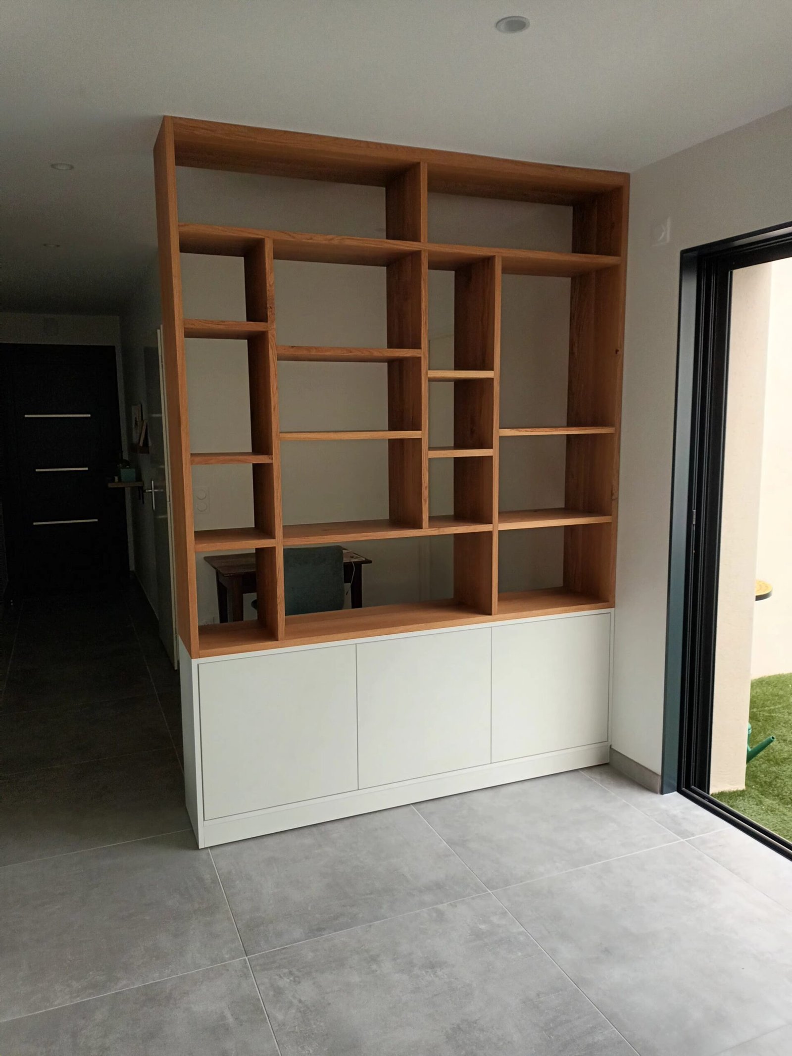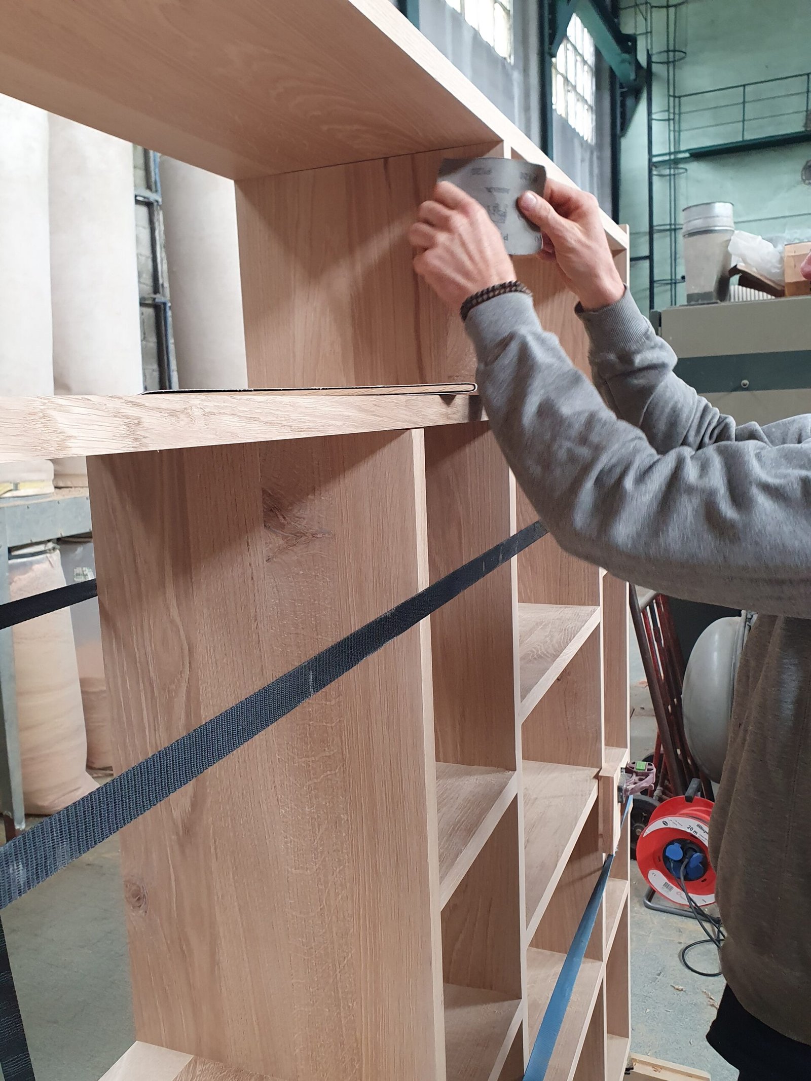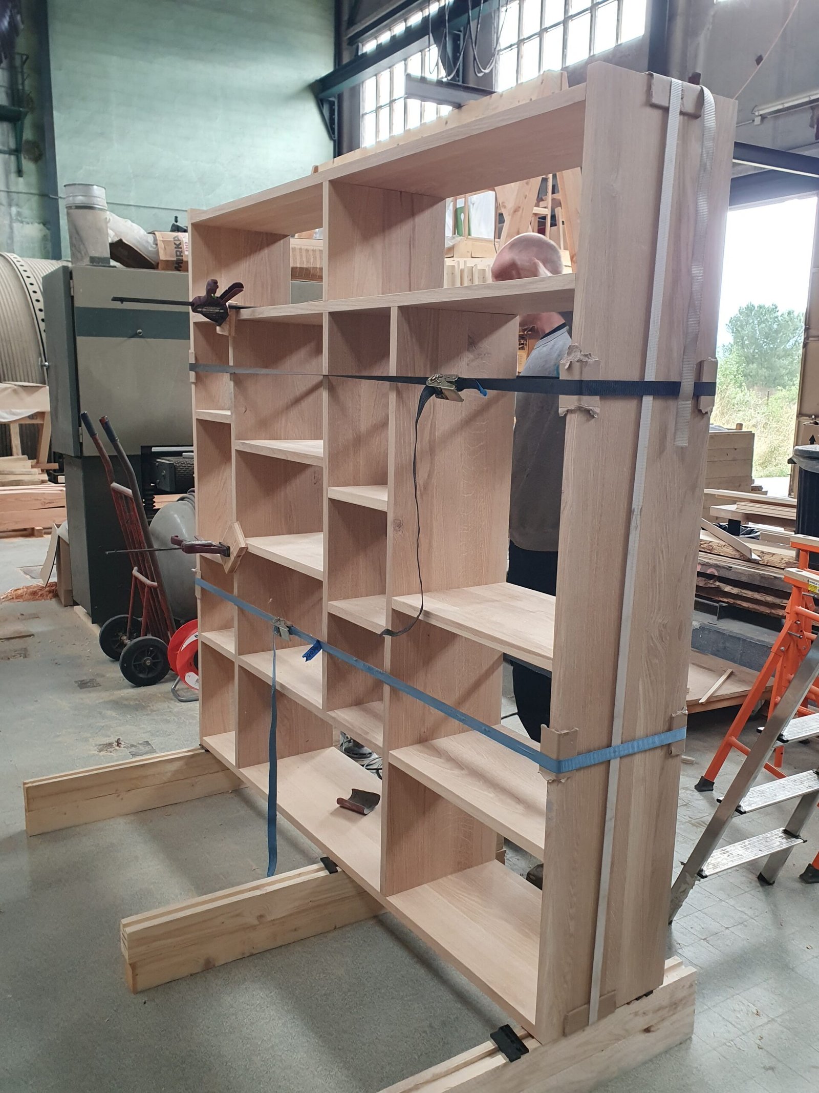 Fabrication d'une bibliothèque en chêne massif servant de bibliothèque et de claustra.