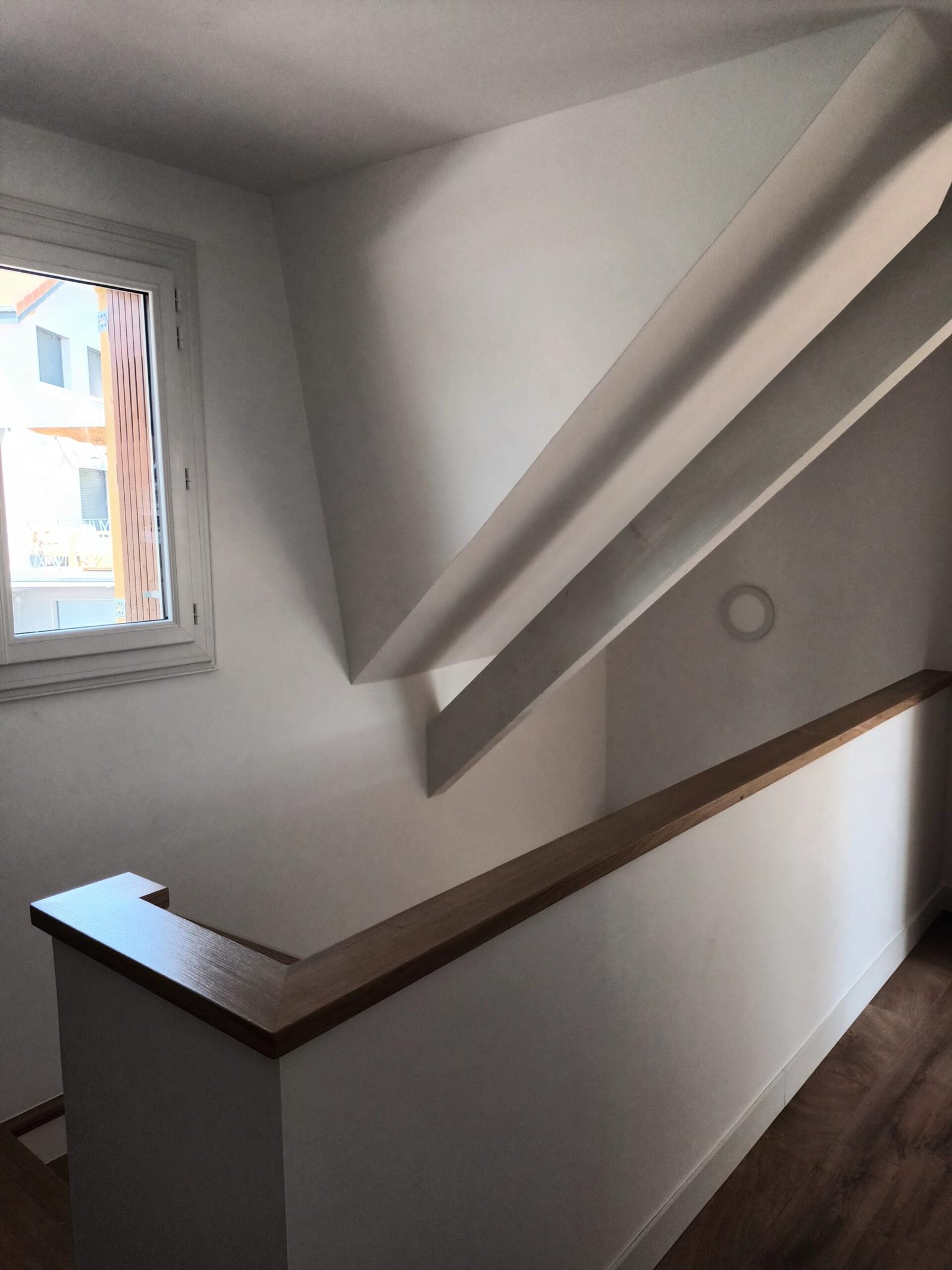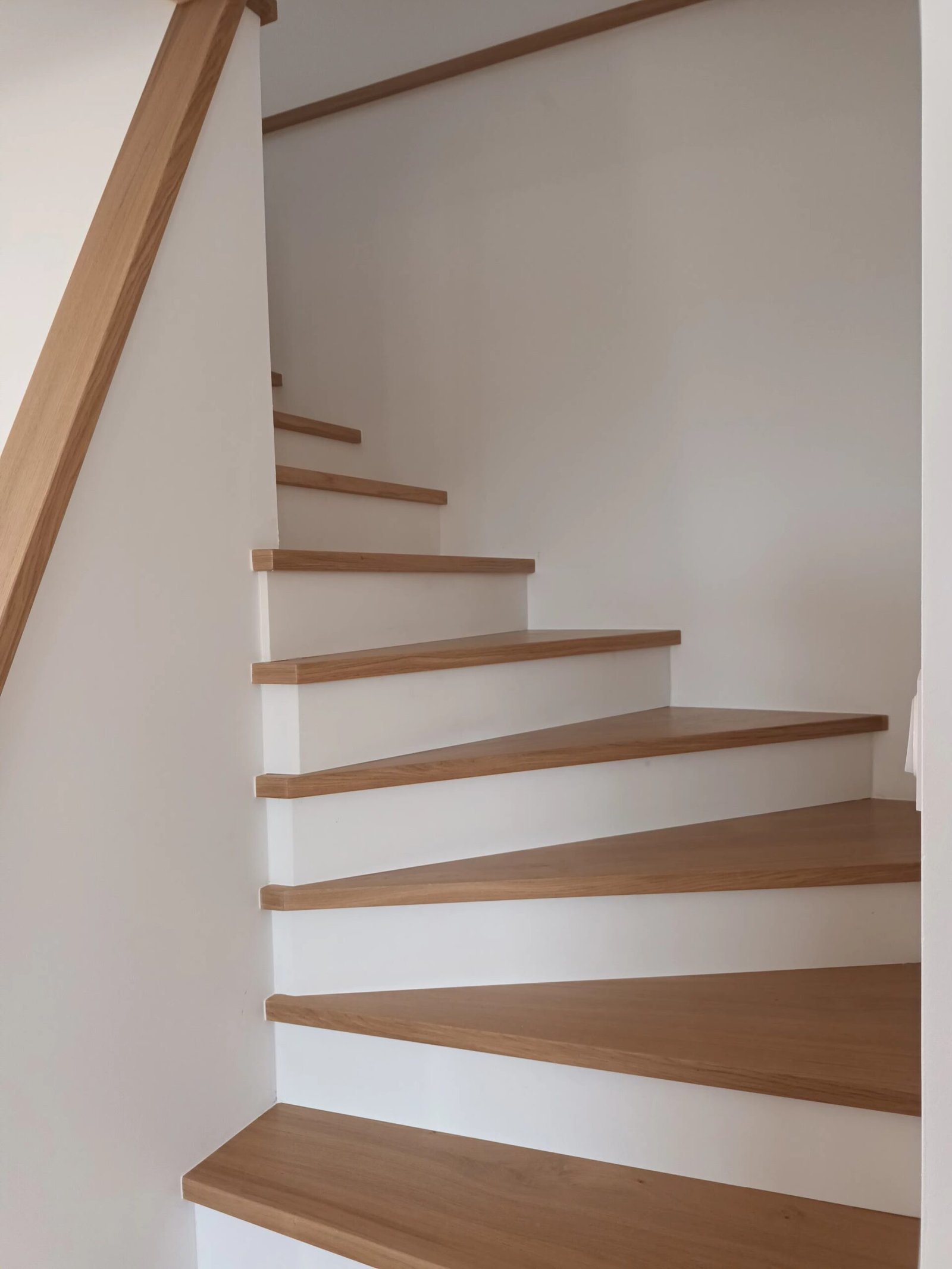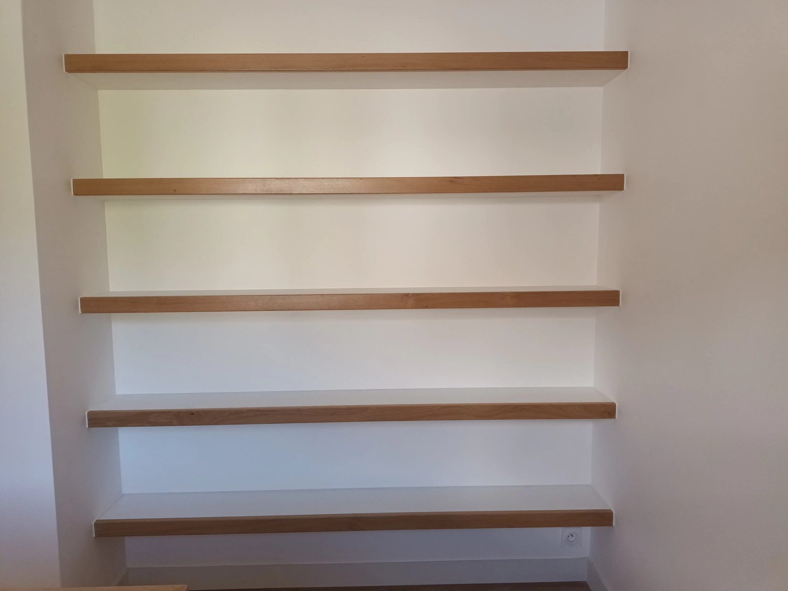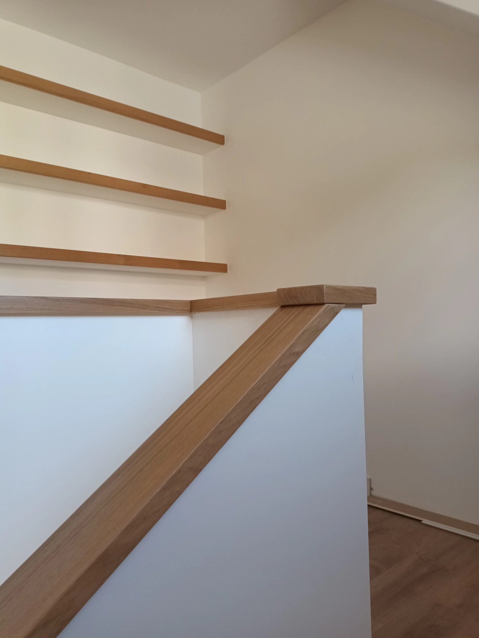 Habillage des marches et mains courantes par du chêne massif. En complément de l'escalier nous avons réaliser des tablettes d'étagères.
