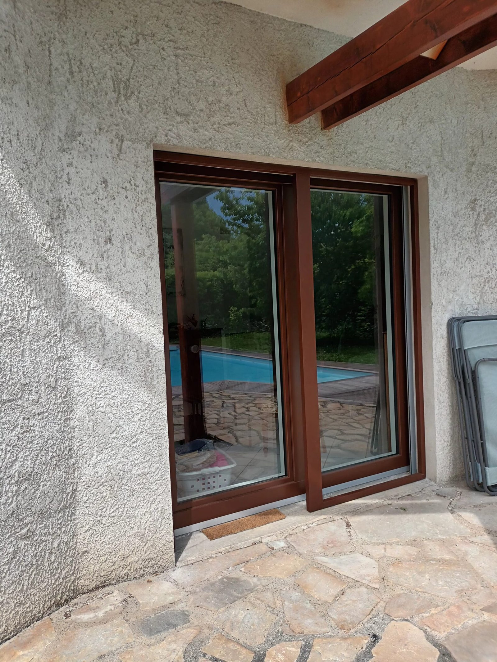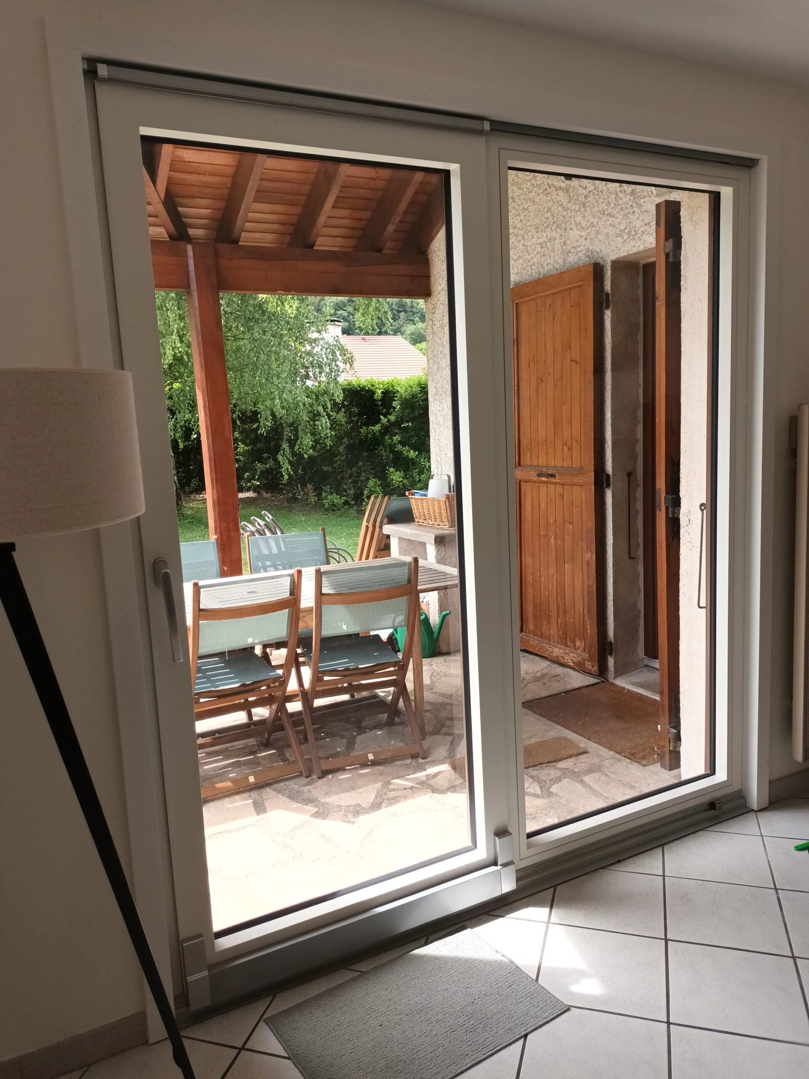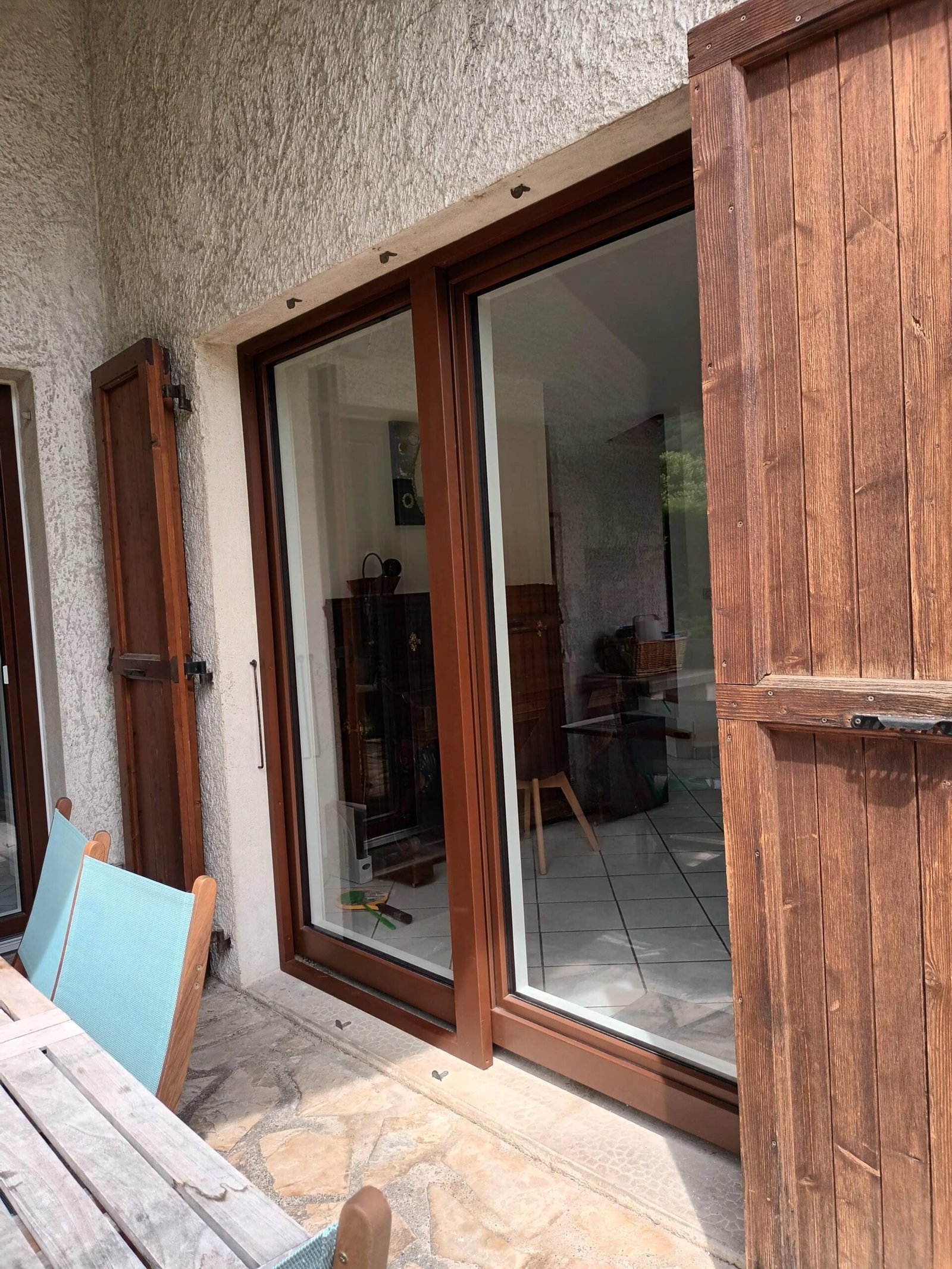 Changement des menuiseries extérieures par des fenêtres en mélèze laquées et bois-alu. Intégration de moustiquaires aux châssis