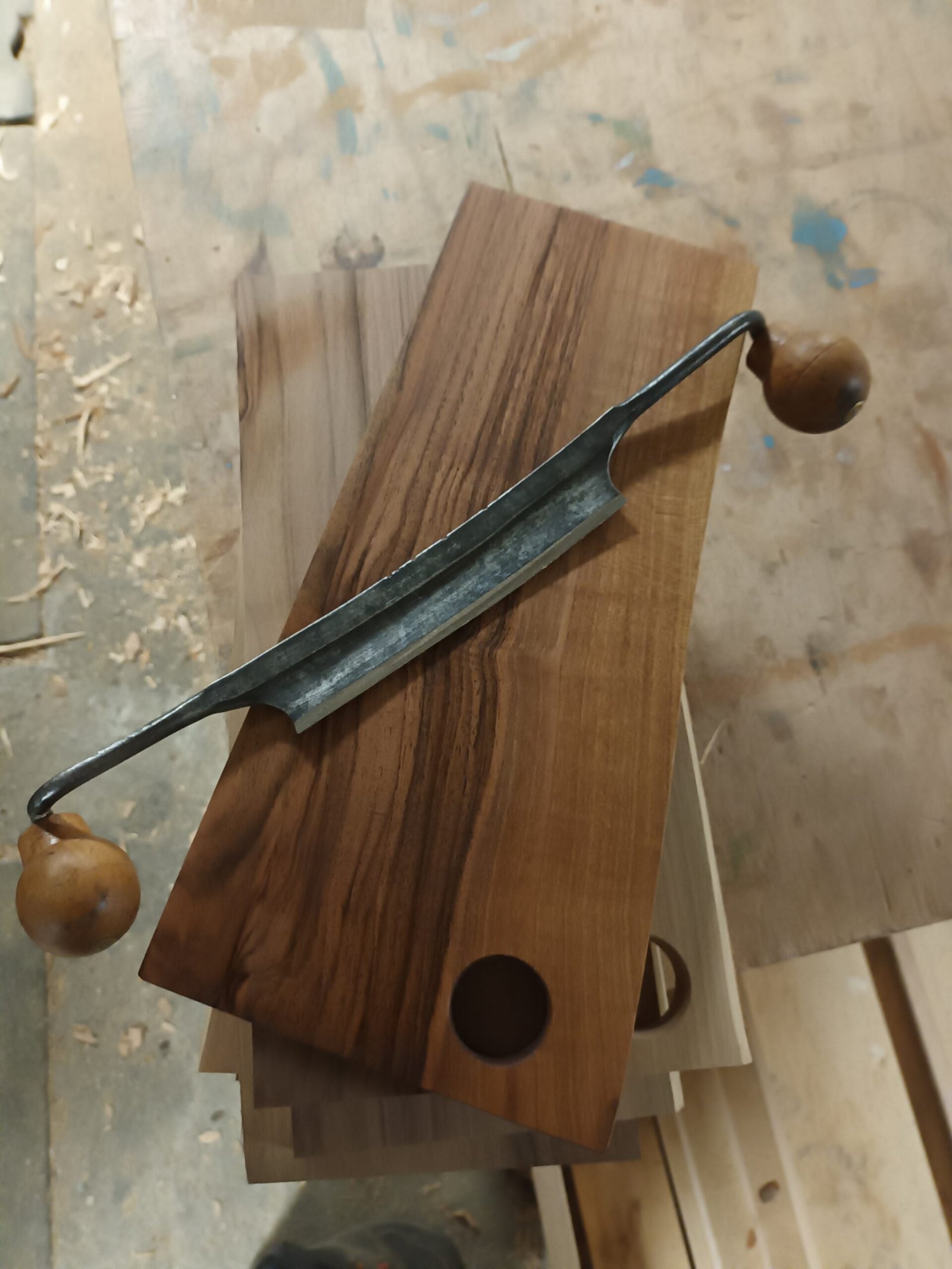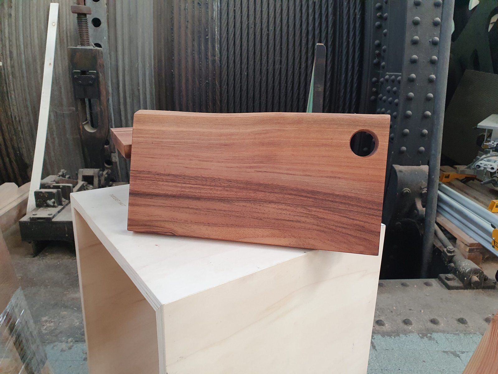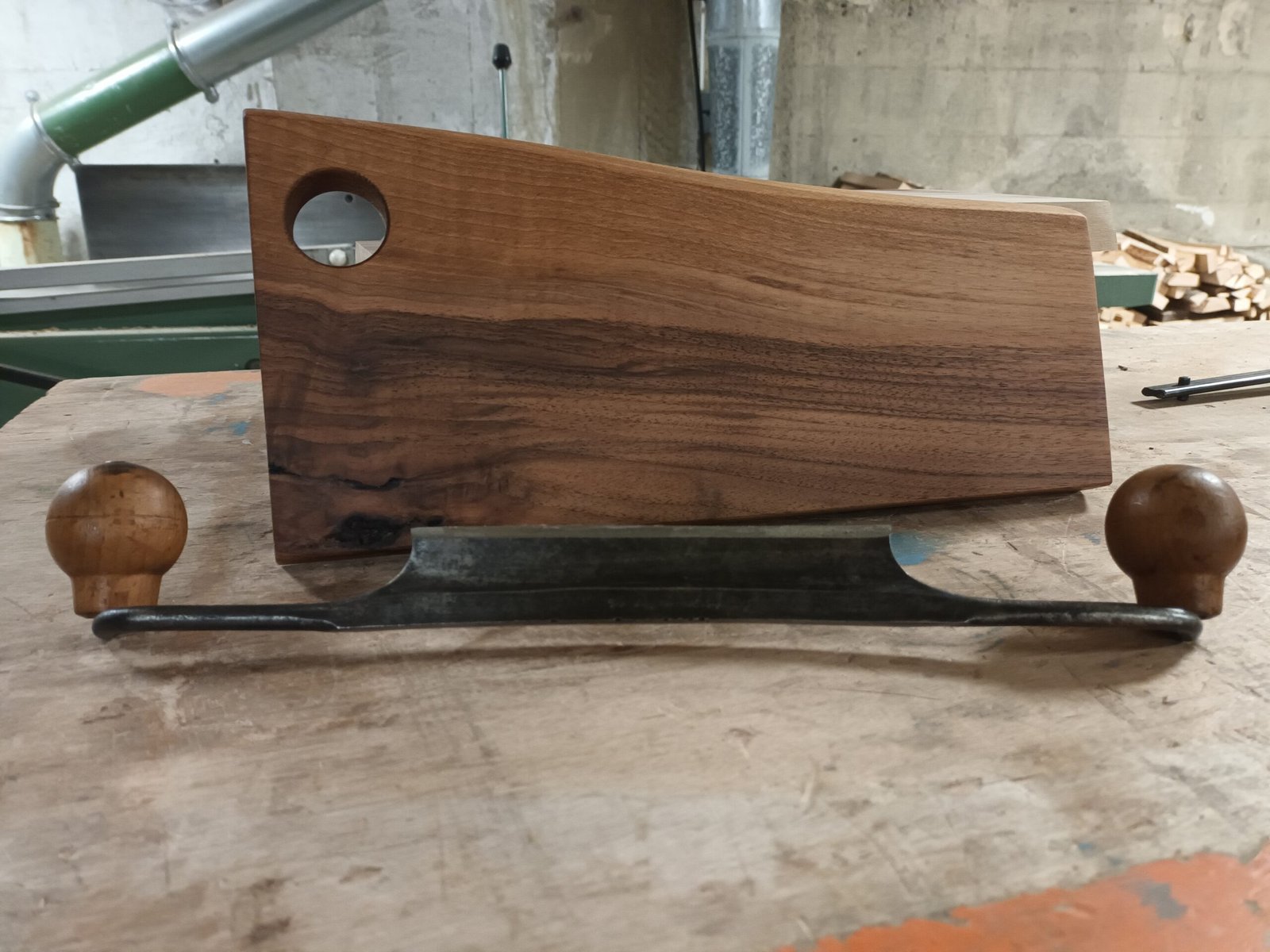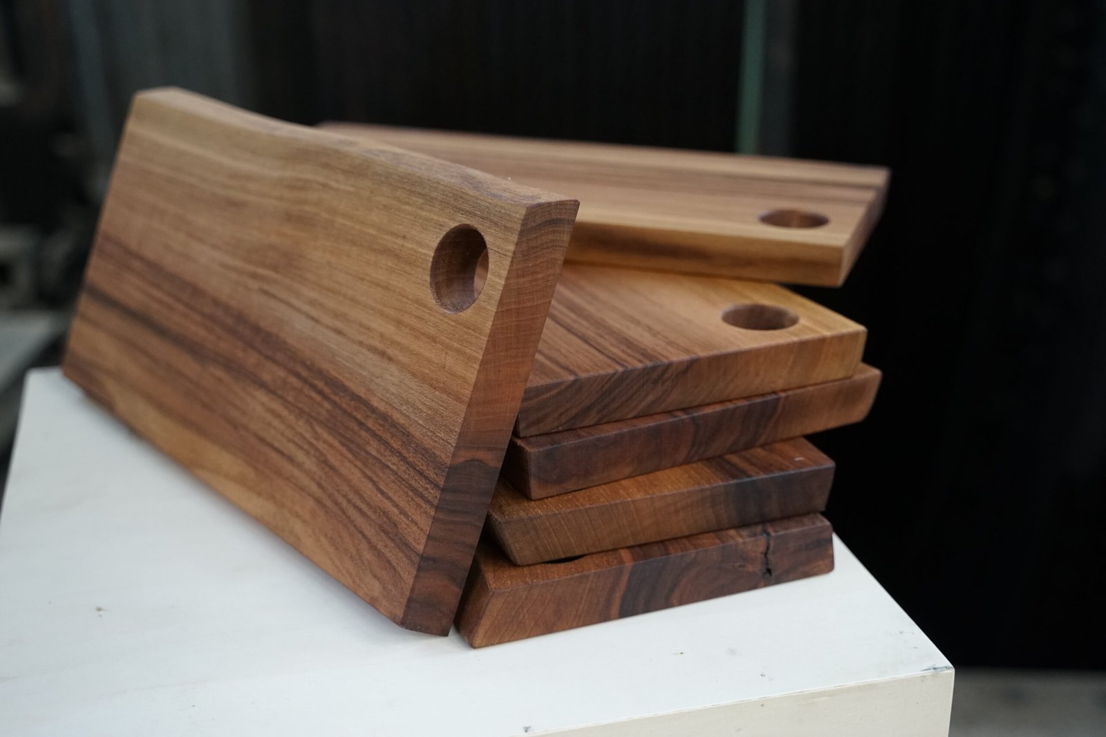 Confection de planches à découper petit format en noyer massif avec un coté style naturel.