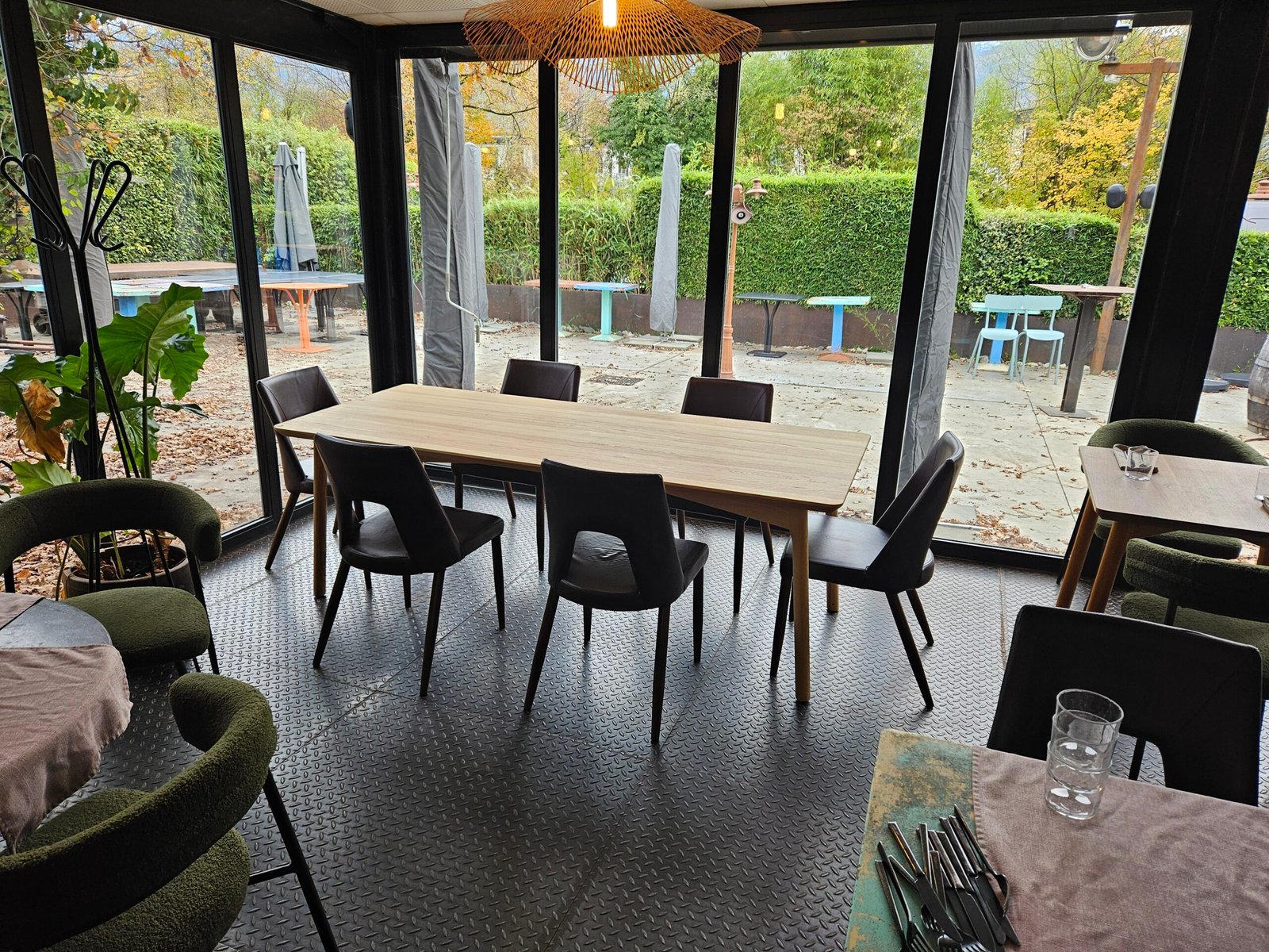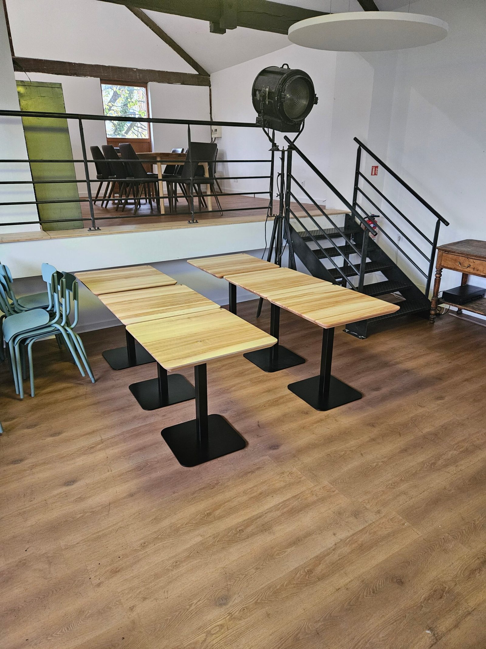 Réalisation de tables en bois massif pour le restaurant Le garage à Grenoble. Table en Frêne olivier massif. Trois tables de huit personnes et six tables bistrots sur pieds en acier laqué noir.