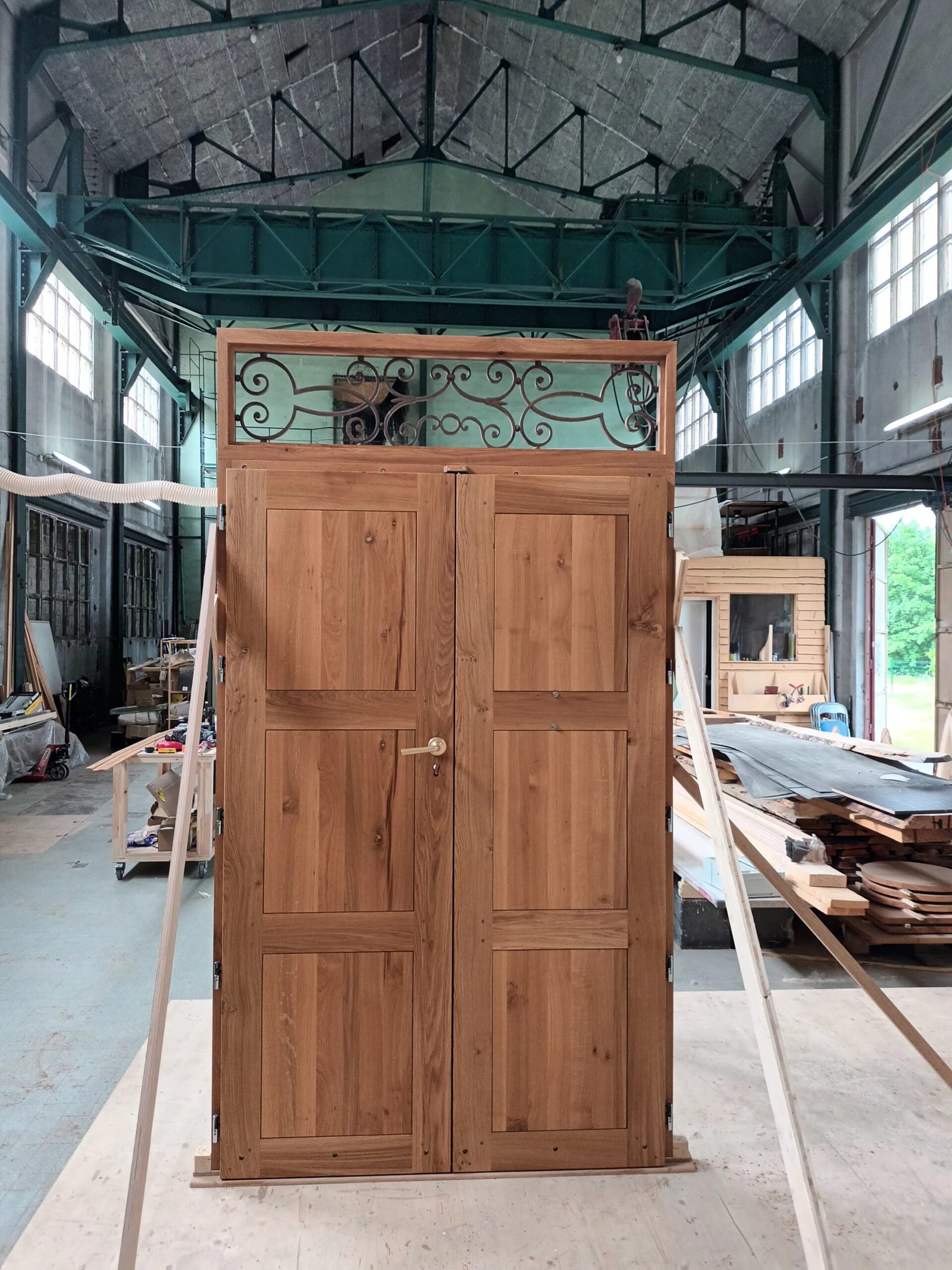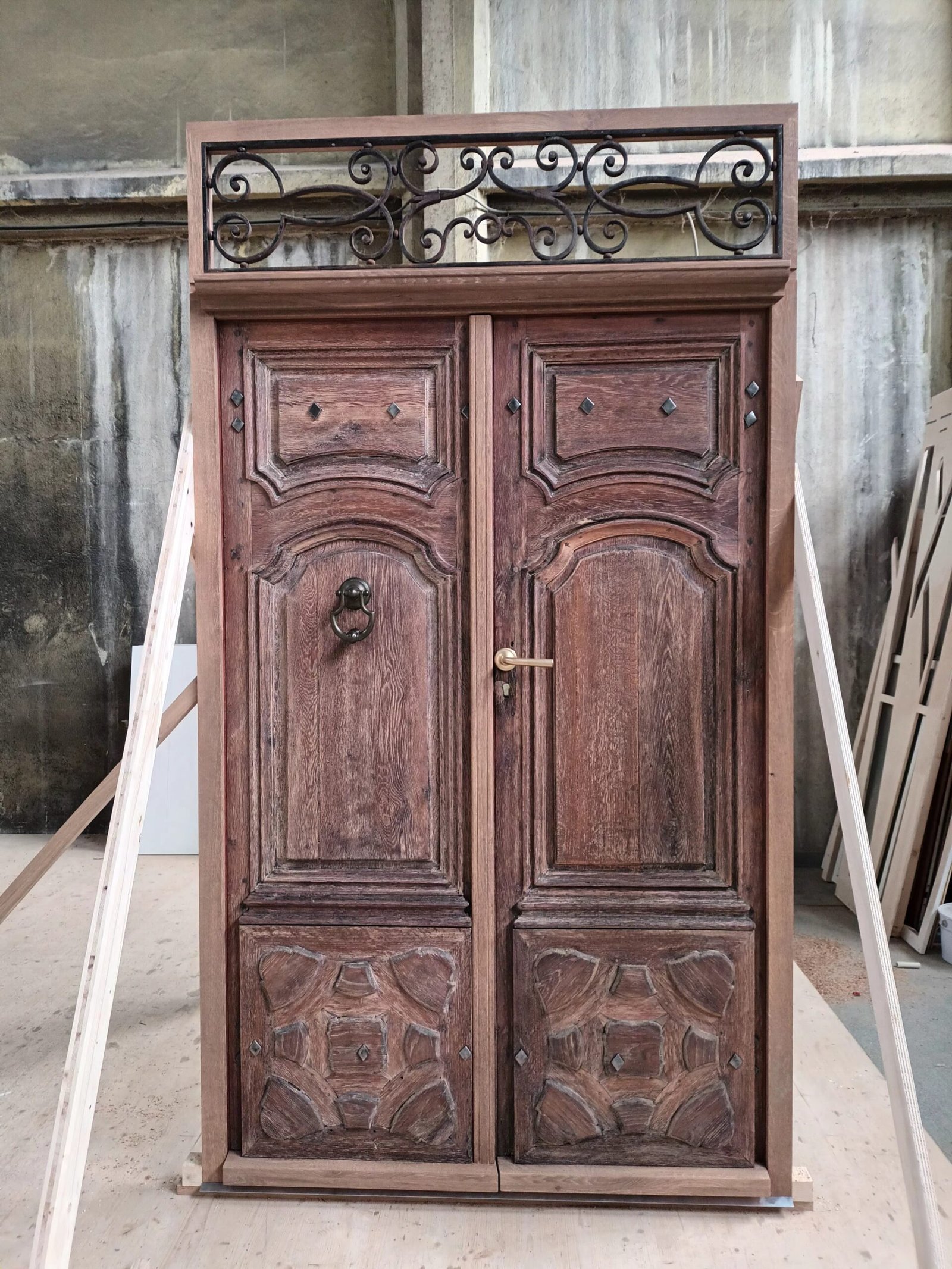 Restauration d'une porte en chêne massif. Réalisation d'un doublage intérieur pour garantir l'isolation de l'ouvrage