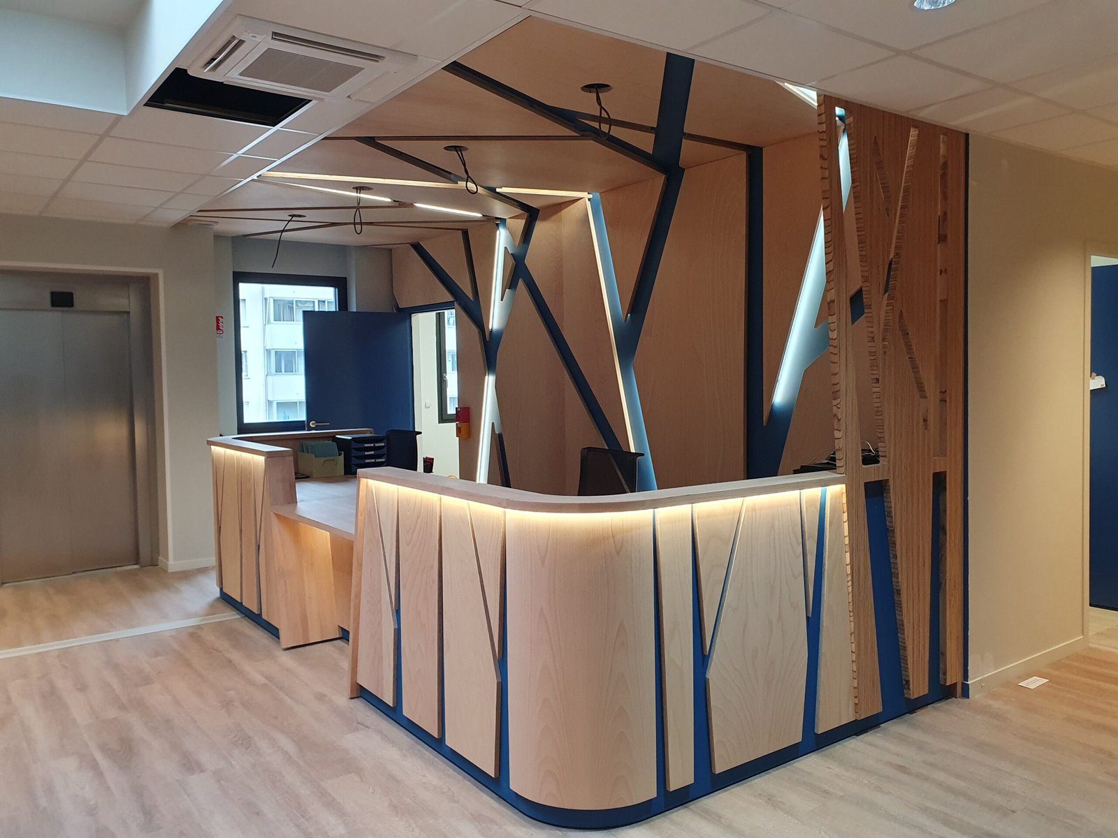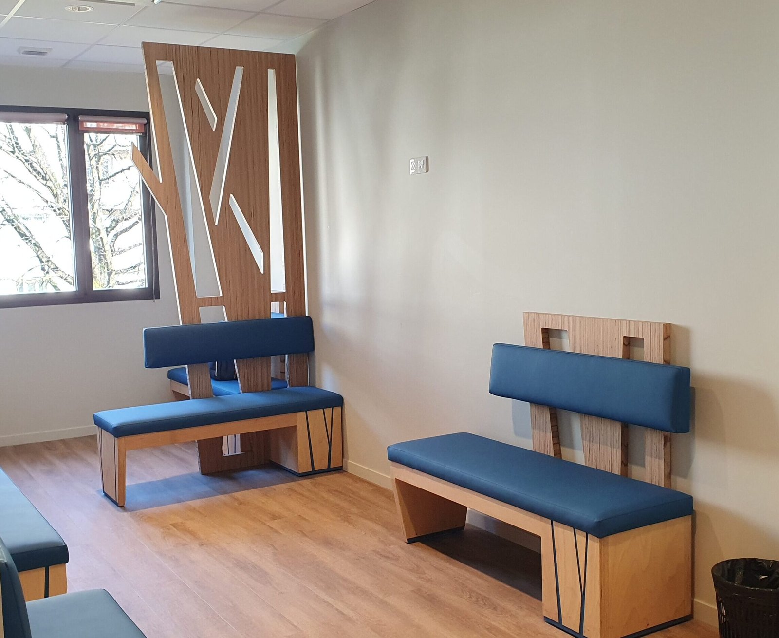 Réalisation d'une salle d'attente et d'une banque d'accueil sous la directive de Philippe Maillard (Cabinet M@d). Un ensemble composé de baubuche, de contreplaqué hêtre et de bois massif. Les assises et dossiers ont été réalisées à la main par Grégory Strapazzon en isère.
