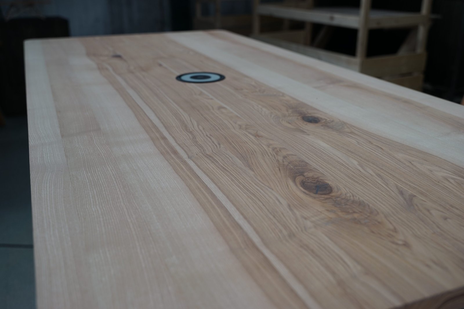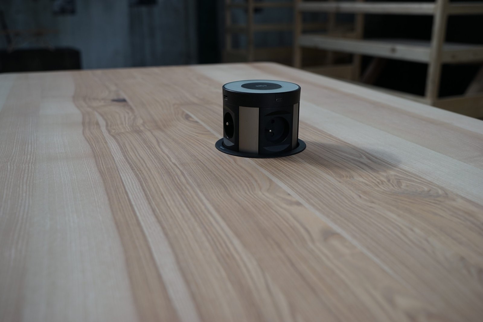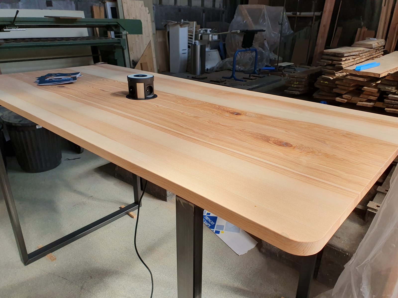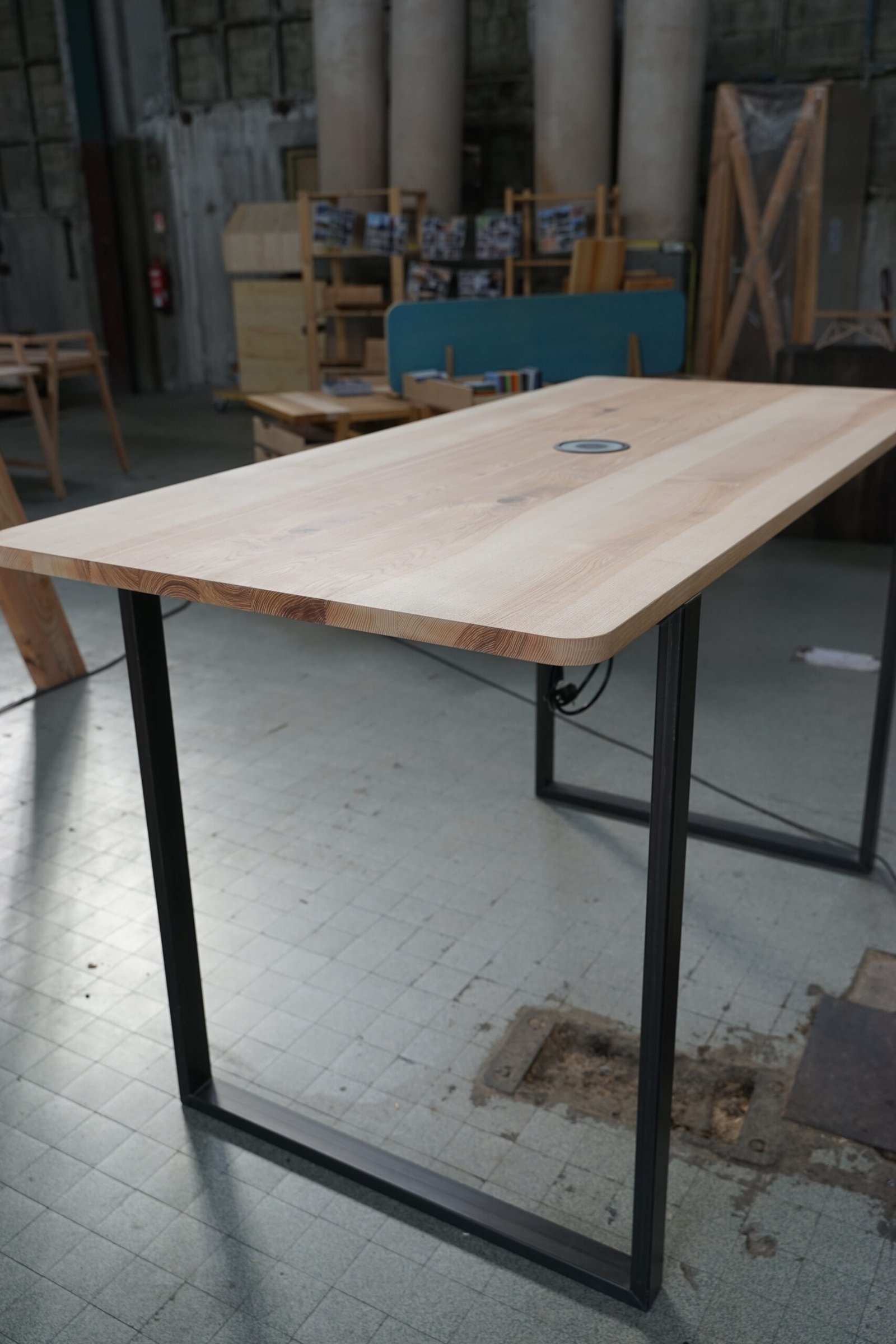 Réalisation d'une table bois-acier de style industriel avec un plateau en bois massif et un piètement en tube rectangle. Insertion d'un hub électrique centrale.